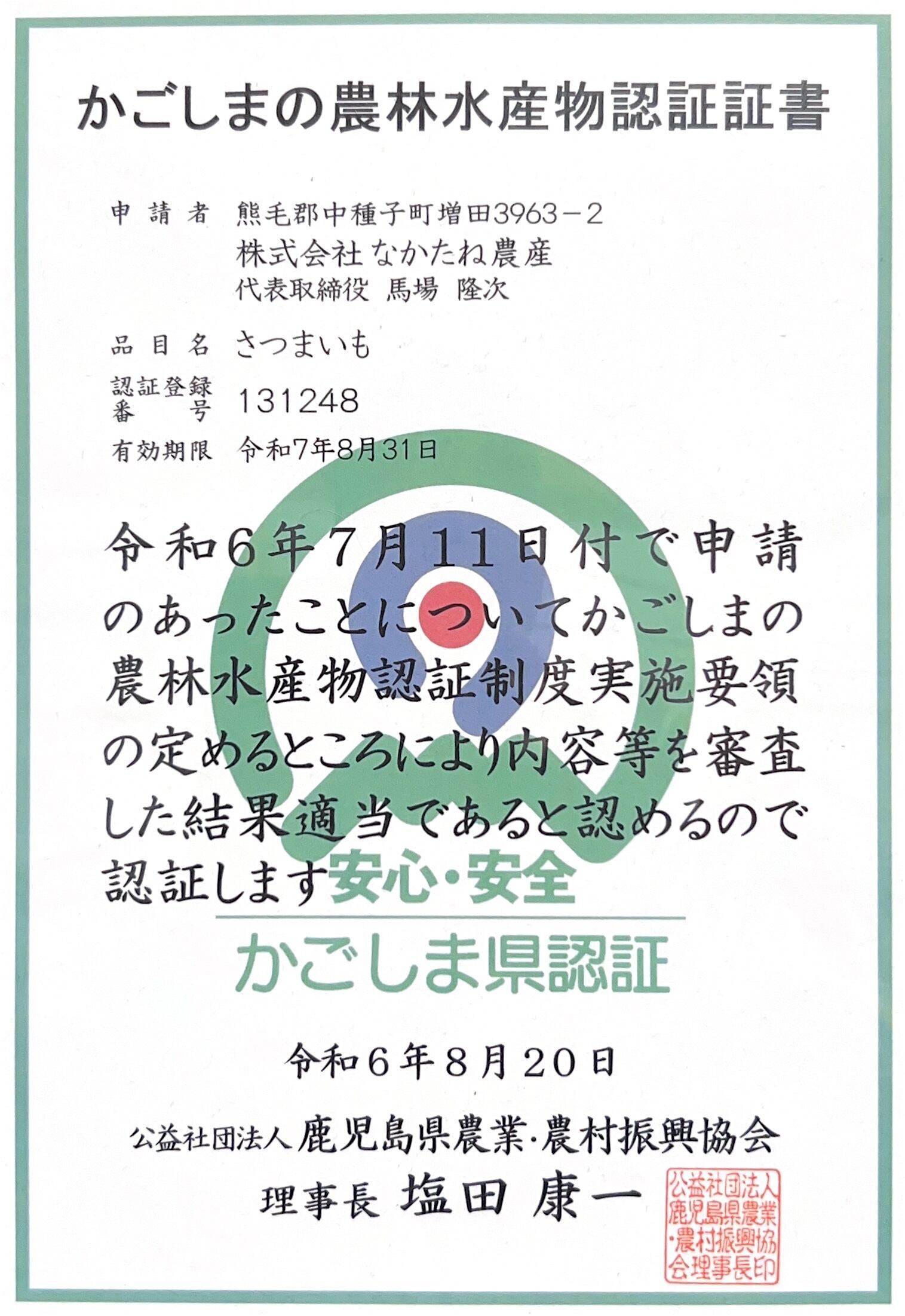 株式会社なかたね農産は、安心・安全な農林水産物を生産する取り組みを認証する鹿児島県の農林水産物認証(K-GAP)を取得しています。さらに、一般社団法人安納いもブランド推進本部が実施する厳しい糖度検査と残留農薬検査にも合格した甘くて美味しい安納芋をお届けしています!